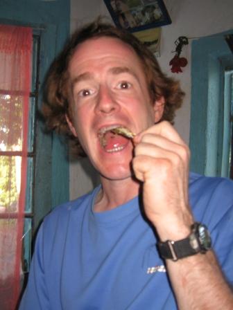 Patrick and his hiking companion, a recent PhD graduate from Holland, timed their hike so as to arrive just in time to enjoy the food the ladies had cooked. It included nsima (the local staple made from cassava flour, which Diane ground and sifted herself), cassava leaves that they had picked, yellow flower buds (perhaps from pumpkins), and usipa (small dried fish) that had been cooked in oil with a bit of tomato paste. The fish are eaten heads, bones, scales, and all. We didn’t eat very much by local standards, but we didn’t want to offend our hosts.