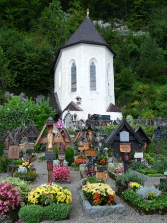 The prettiest graveyard I’ve ever seen is located outside the Catholic church in the village of Hallstatt in the Salzkammergut lake region of Austria.  This village of about one thousand people is sandwiched between the Hallstatter See (lake) and the steep hillsides that ring the lake.